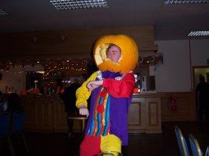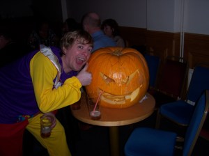 On November 28th 2009, my friend held a birthday party at Mangotsfield Rugby Club in Bristol.  Since it was the weekend before Hallow’een, everyone dressed up in suitably “ghoulish” attire.  I dressed as a jester for some reason, but I did grow an enormous jack o’ lantern and take with me as my vegetable plus one: