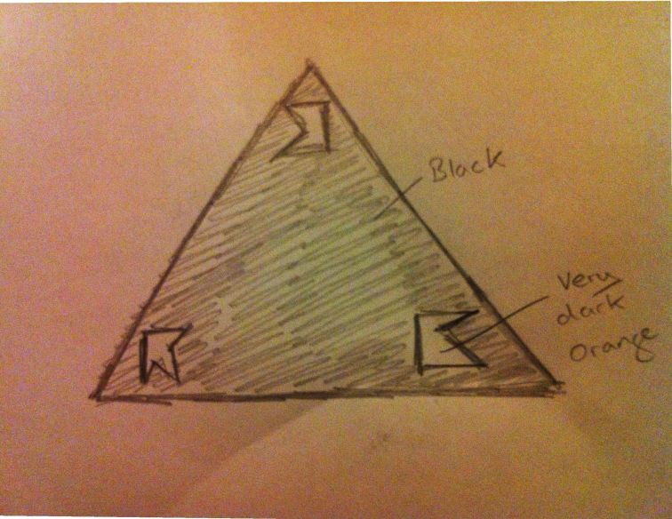 When I got home, I drew a sketch of the UFO to the best of my memory/ability.  The most notable features of this shape was that it was triangular, big, silent, and had three bizarre shapes on each corner.  The shapes were a slightly lighter colour, like a burnt amber colour.  Below is my sketch: